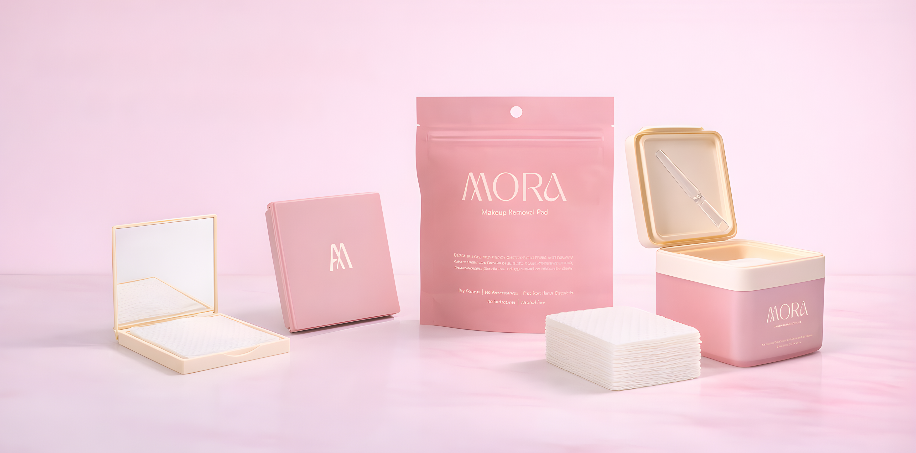 MORA is a water-activated dry cleansing pad. Add water, squeeze out excess, and cleanse—no alcohol, no harsh surfactants, and no residue.